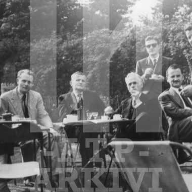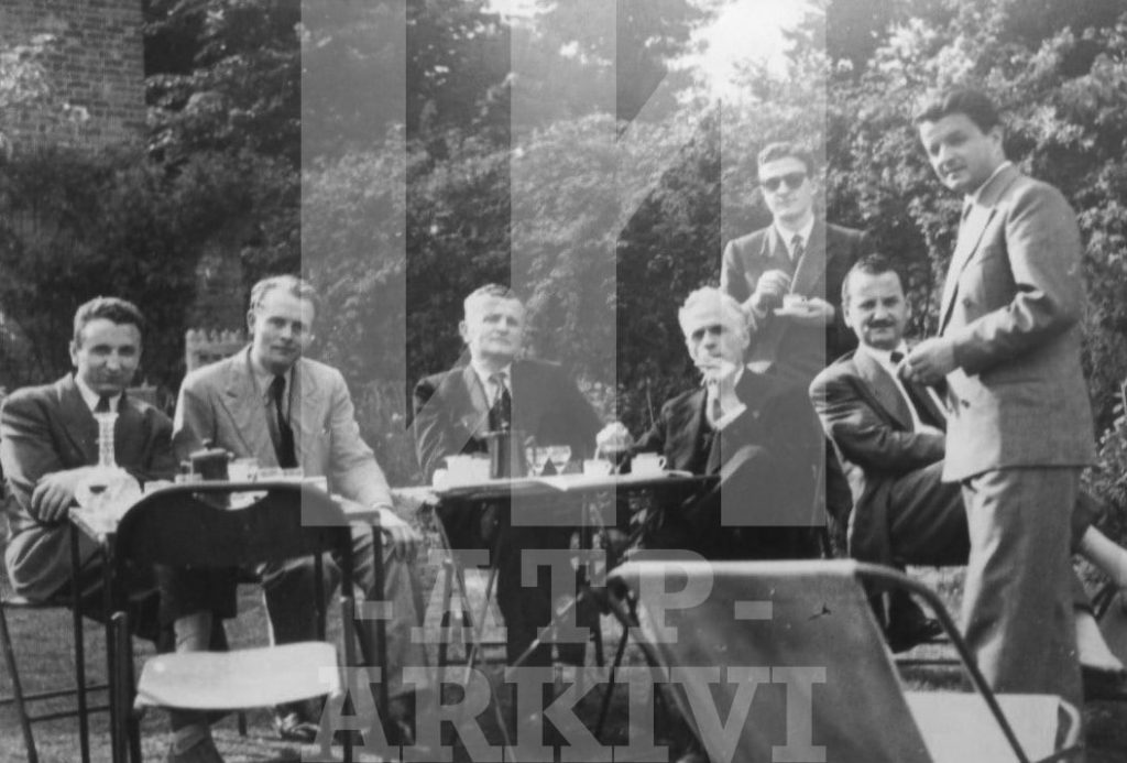 Komiteti ‘Shqipëria e Lirë’ në ambjente pushimi, përpara dhënies së intervistës radiofonike për BBC. Shtator 1949, Londër. | The ‘Free Albania’ committee in a resting area, before giving a radio interview to the BBC. September 1949, London.
