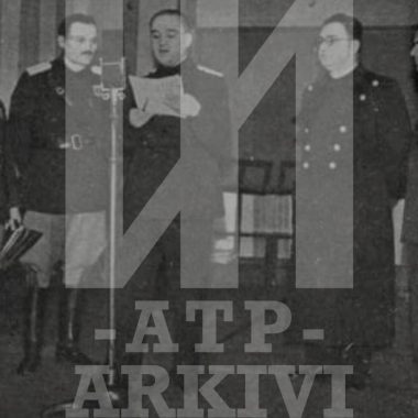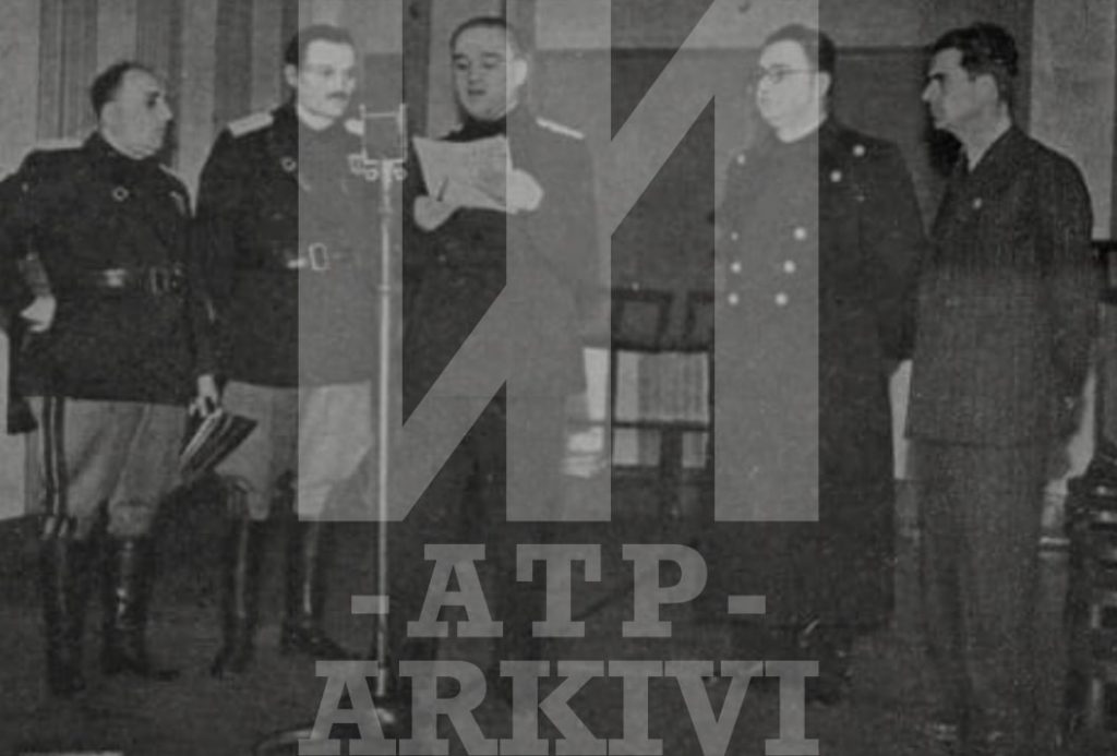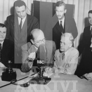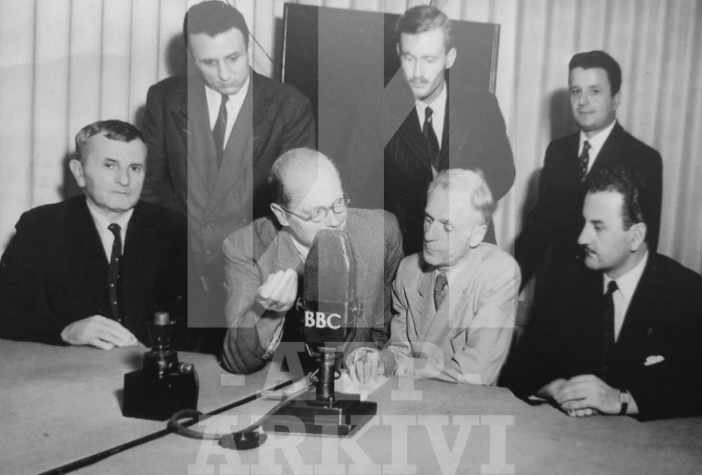 Komiteti ‘Shqipëria e Lirë’ me në krye Mid’hat Frashërin duke dhënë një intervistë radiofonike për BBC. Shtator 1949, Londër. | The ‘Free Albania’ committee headed by Mid’hat Frashër giving a radio interview to the BBC. September 1949, London.