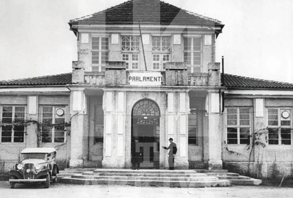 Parlamenti Shqiptar pamje ballore. | The Albanian Parliament front view.